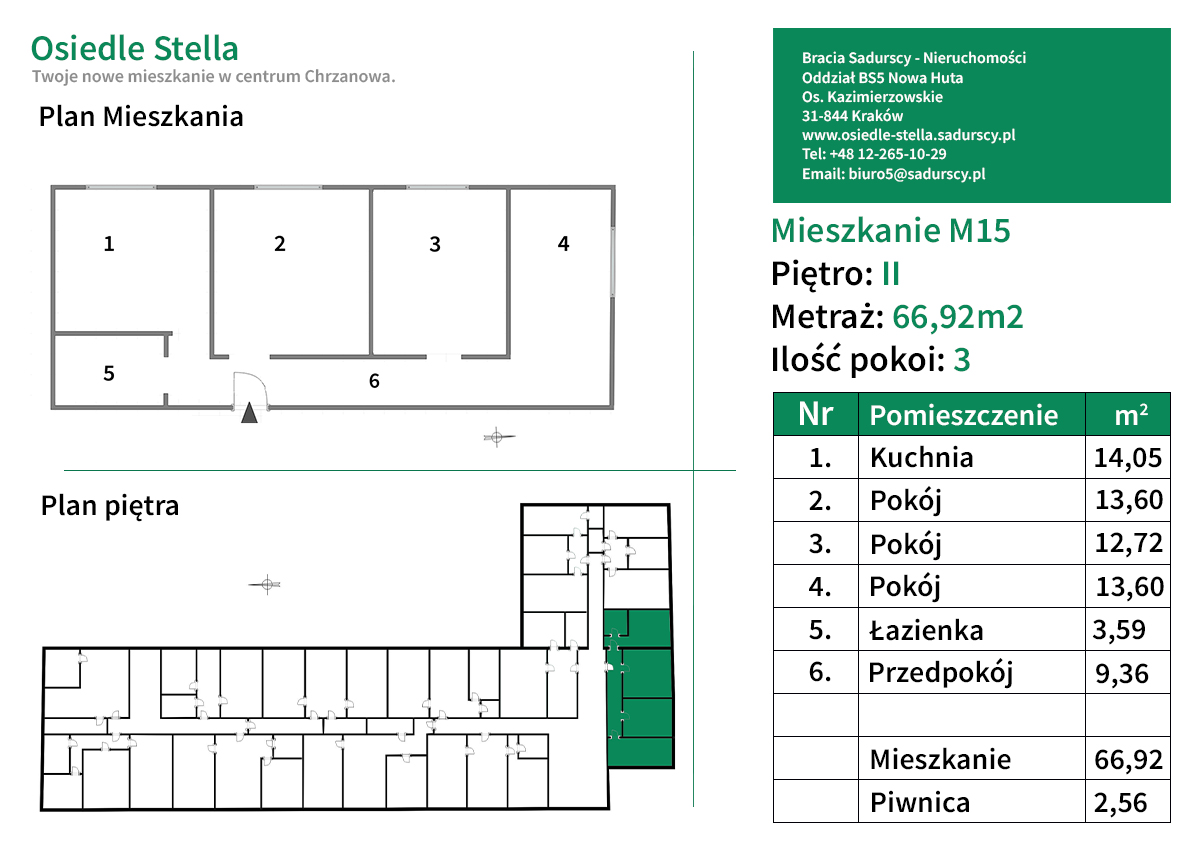 Oferta dotyczy mieszkania o pow. 66,92 m2. Mieszkanie na 2. piętrze, składa się z pokoju dziennego (13,60 m2), pokoju (13,60 m2), pokoju (12,72 m2), kuchni (14,05 m2), łazienki (3,59 m2) oraz przedpokoju (9,36 m2).